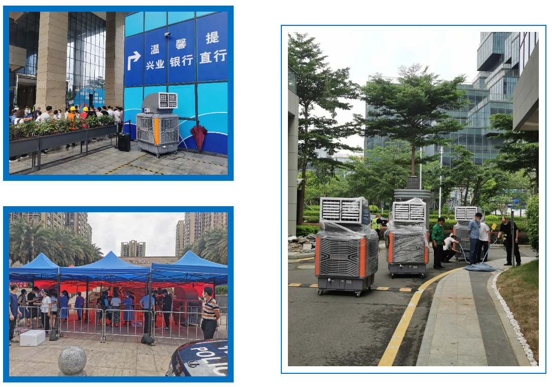 為了防患于未然,松山湖疫情防控指揮辦在進(jìn)行工作部署時,將現(xiàn)場降溫列為重要保障舉措之一。25日一早,廣東瑞泰通風(fēng)降溫設(shè)備有限公司應(yīng)邀在光大we谷,金域松湖,藍(lán)思科技和錦繡山河四個采樣點設(shè)置了瑞泰風(fēng)移動式冷風(fēng)機(jī),助力戶外降溫,全力保障接下來的檢測工作,這也是瑞泰風(fēng)二度為松山湖抗疫提供愛心降溫服務(wù)了。早上8:30,松山湖全園區(qū)檢測工作正式拉開帷幕,從各個采樣點反饋的情況來看,所有冷風(fēng)機(jī)全力運轉(zhuǎn),現(xiàn)場降溫效果明顯。